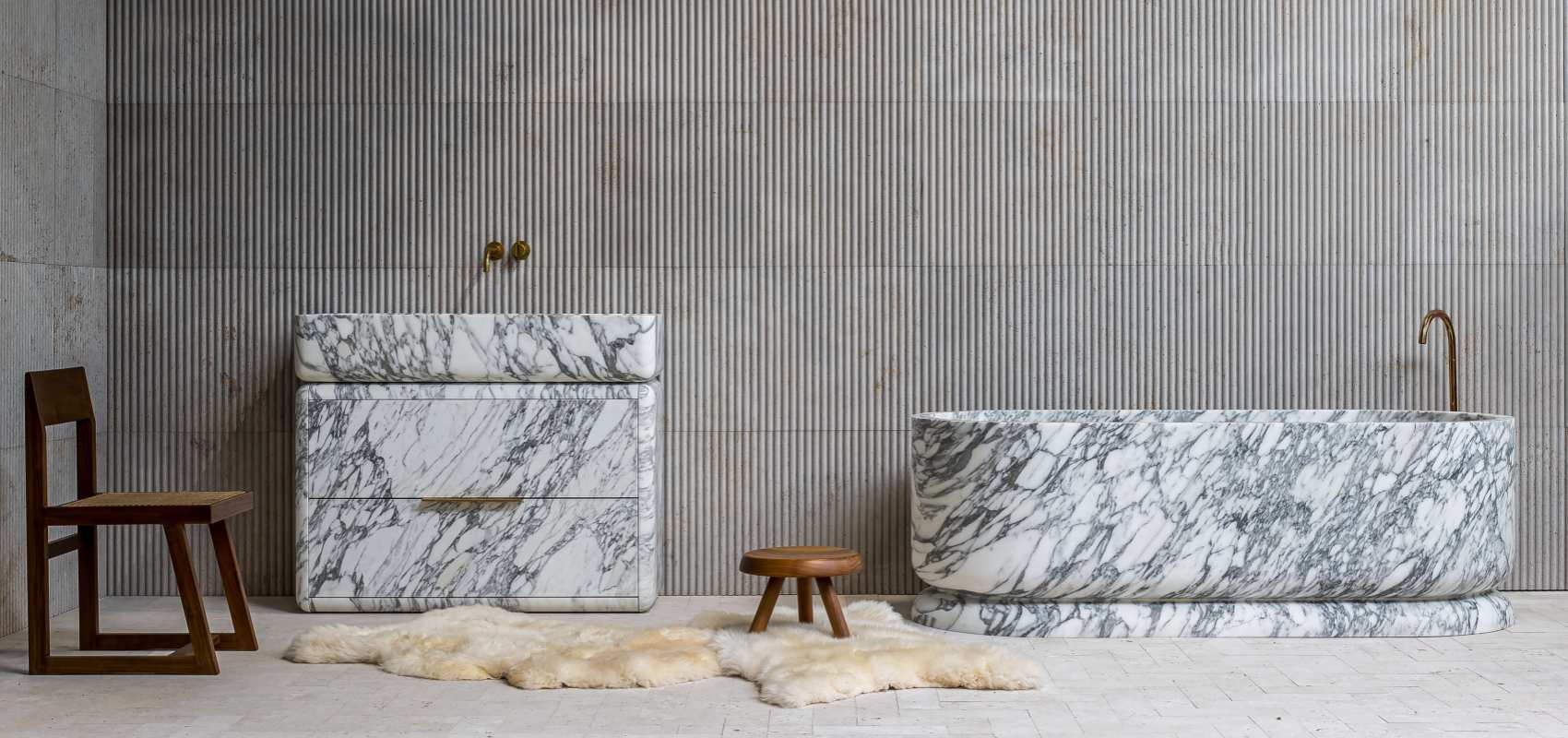 يتم دمج الرخام في كل مساحة على شكل أثاث لتحقيق وحدة التصميم.