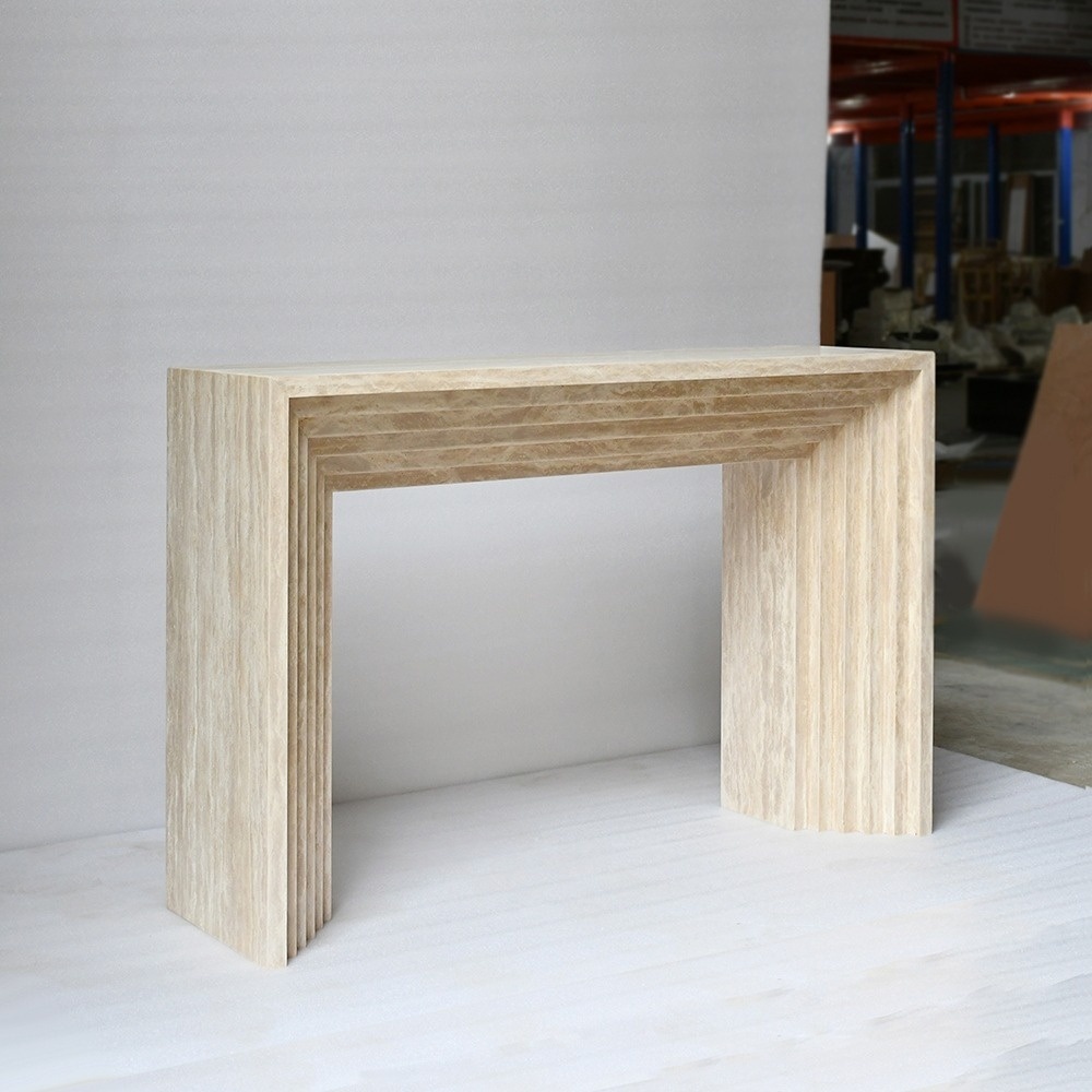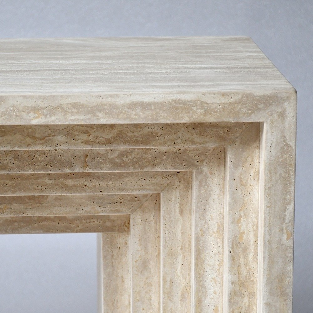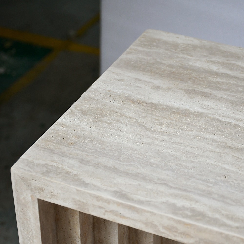 تتميز الطاولة بإطارها المتدرج والمتداخل بشكل لافت للنظر: سلسلة من الفتحات المستطيلة المتداخلة والمقعرة تمتد على طول الجانب السفلي لسطح الطاولة وصولاً إلى الأرجل العمودية، مما يخلق شكلاً معمارياً ثلاثي الأبعاد متناغماً. وتُضفي الحواف العمودية المخددة على الأرجل الخارجية عمقاً ملمسياً، محولةً دعامة عملية إلى عمل فني نحتي يتلاعب بالضوء والظل.